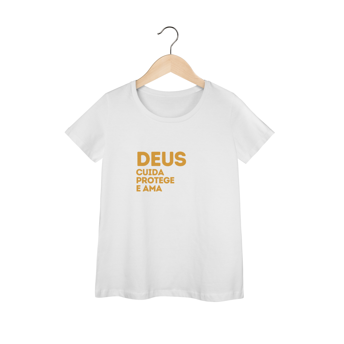 Vista a certeza da presença de Deus com a Camiseta Deus Cuida, Protege e Ama e compartilhe essa esperança com o mundo.