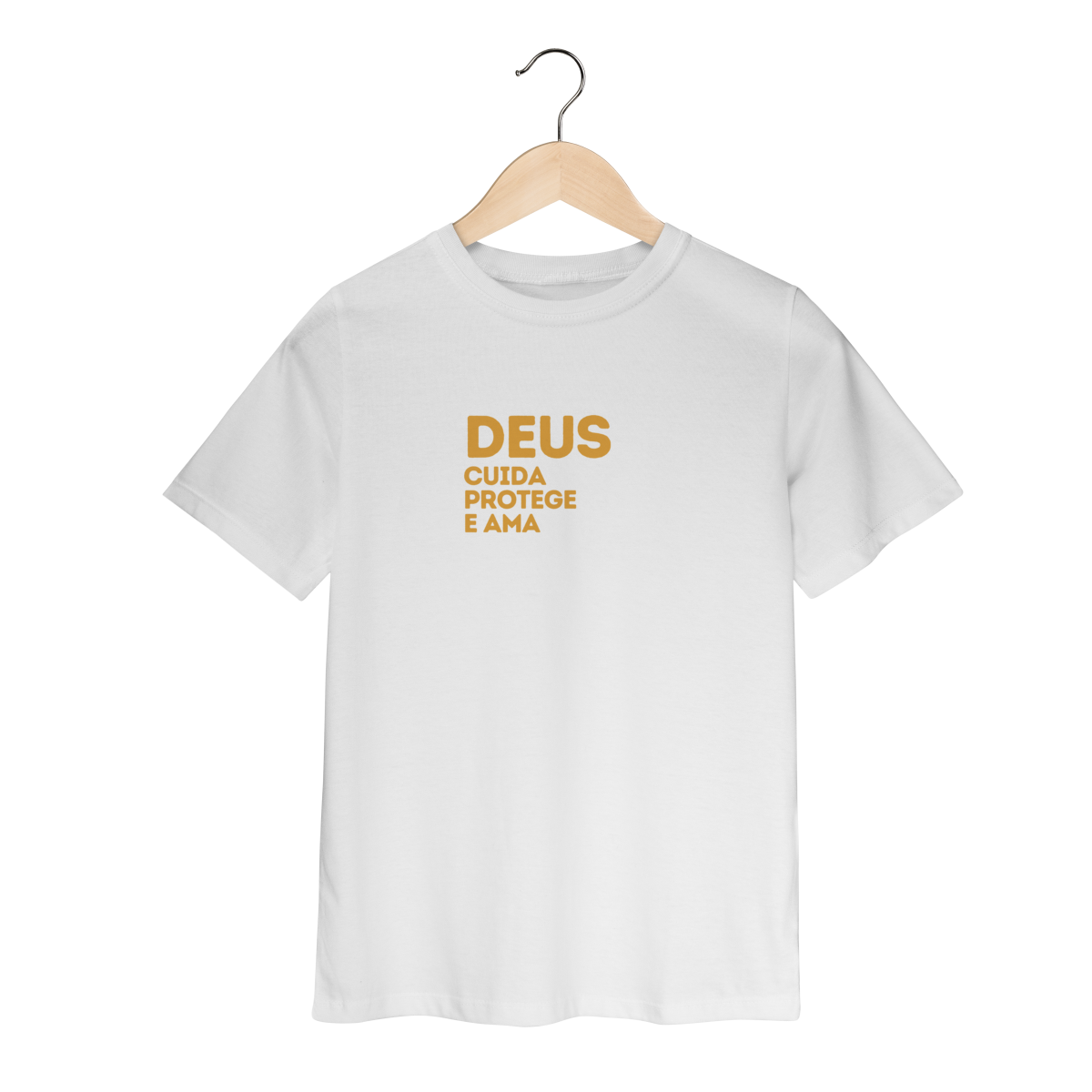 Vista a certeza da presença de Deus com a Camiseta Deus Cuida, Protege e Ama e compartilhe essa esperança com o mundo.
