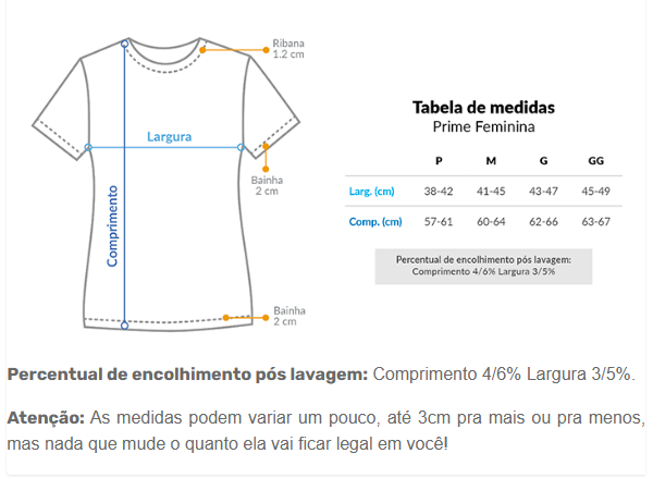 Cores do produto: Como cada tela de computador ou celular tem seu próprio jeito de mostrar cores, então a cor da sua camiseta e da estampa pode ser um pouco diferente do que você viu online.