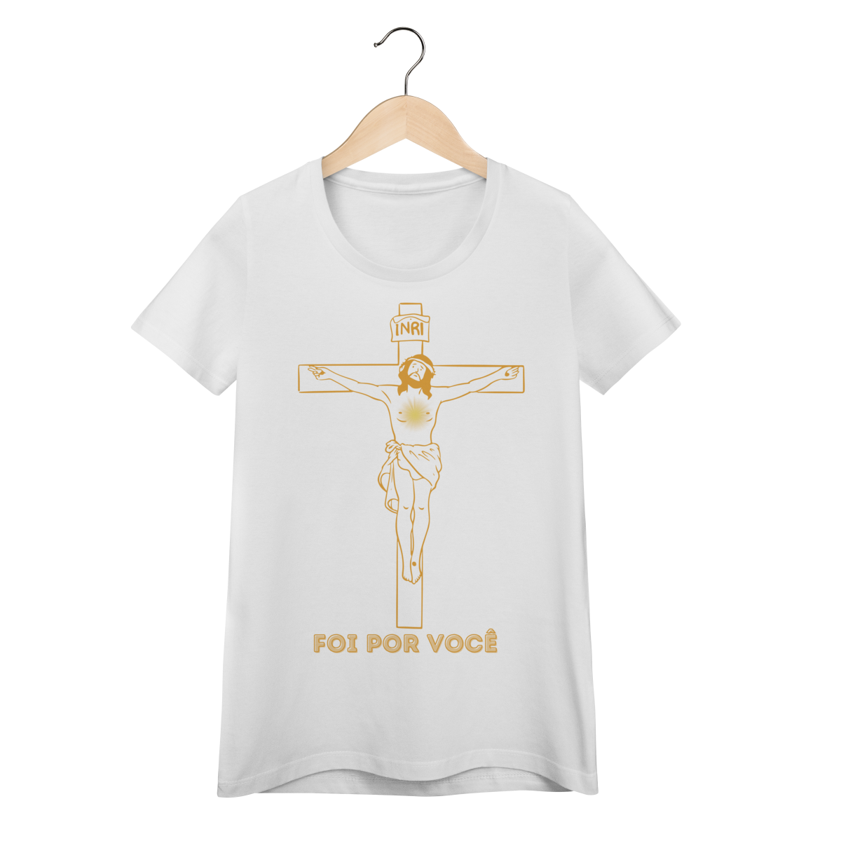 Vista a sua fé e compartilhe a mensagem do amor de Cristo com a Camiseta Foi por Você  - Cruz minimalista dourada.