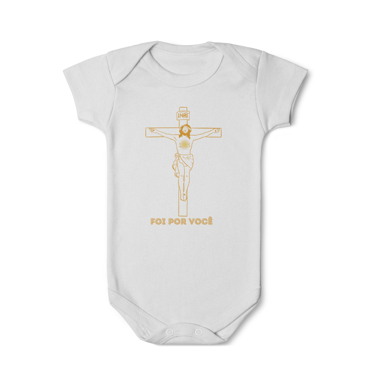 Leve consigo a mensagem mais poderosa do Evangelho com a Body Infantil - Foi por Você - Cruz. Com desenho minimalista em dourado e inspiração no sacrifício de Cristo, essa peça foi criada para quem deseja vestir a fé com significado e estilo.