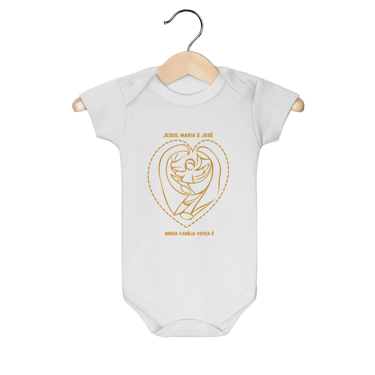 Celebre o amor, a união e a devoção com a Body Infantil - Jesus, Maria e José  - Minha Família. Com um desenho minimalista em dourado exclusivo, essa peça representa a Sagrada Família como inspiração para todos os lares cristãos.