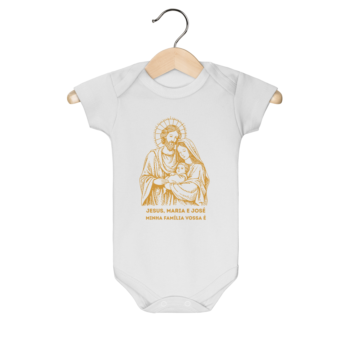 Leve a inspiração da Sagrada Família para o seu dia a dia com a Body Infantil - Sagrada Família. Com um desenho minimalista em dourado exclusivo, essa peça transmite fé, amor e união, tornando-se um símbolo de devoção e esperança para todos os lares cristãos.