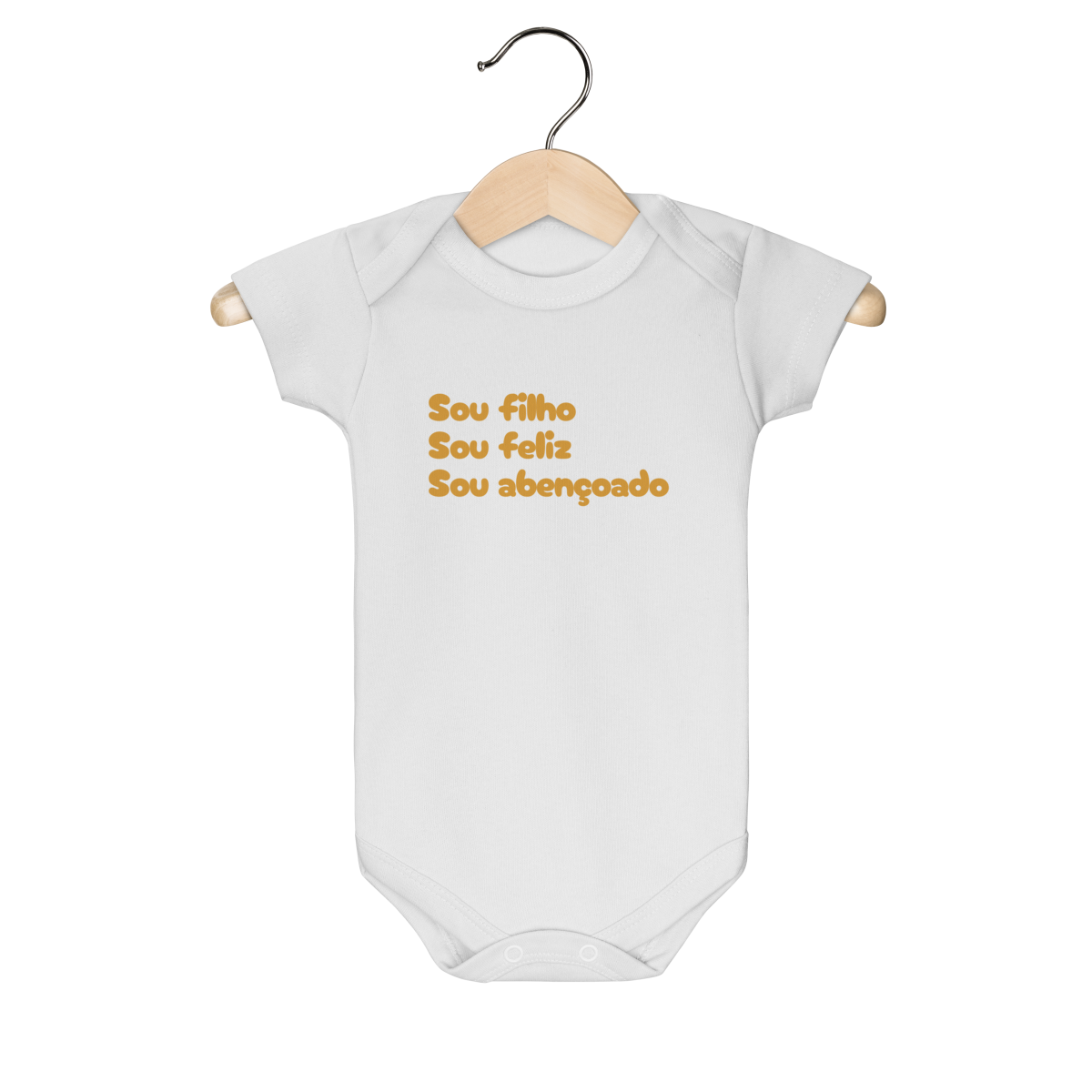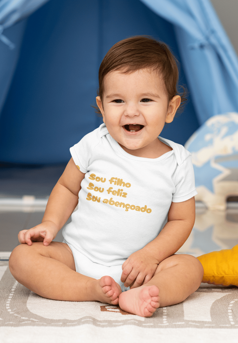 Demonstre sua gratidão e fé com a Body Infantil - Sou Filho, Sou Feliz, Sou Abençoado. Com desenho minimalista em dourado e mensagem inspiradora, essa peça é perfeita para filhos que querem expressar seu amor pela família e por Deus.