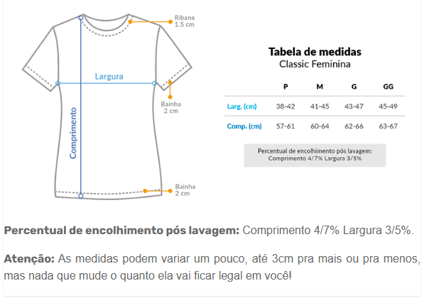 Cores do produto: Como cada tela de computador ou celular tem seu próprio jeito de mostrar cores, então a cor da sua camiseta e da estampa pode ser um pouco diferente do que você viu online.