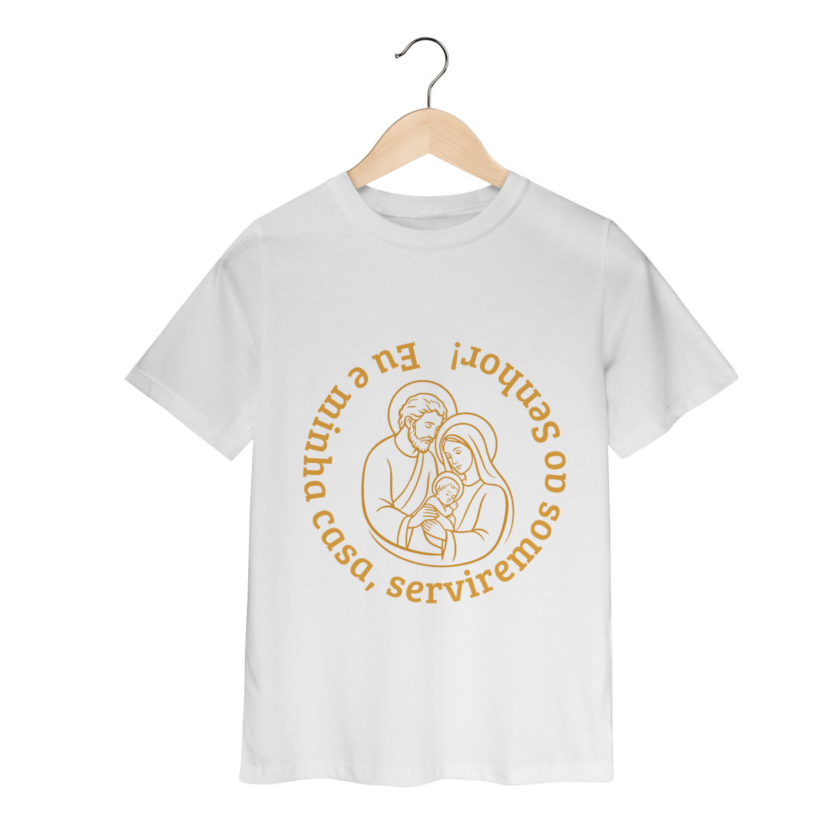 Una estilo, fé e devoção com a Camiseta Classic Infantil - Eu e Minha Casa Serviremos ao Senhor. Com desenho minimalista em dourado e a imagem da Sagrada Família, essa peça traduz o versículo bíblico de Josué 24:15 em uma mensagem visual de amor, união e compromisso com Deus.