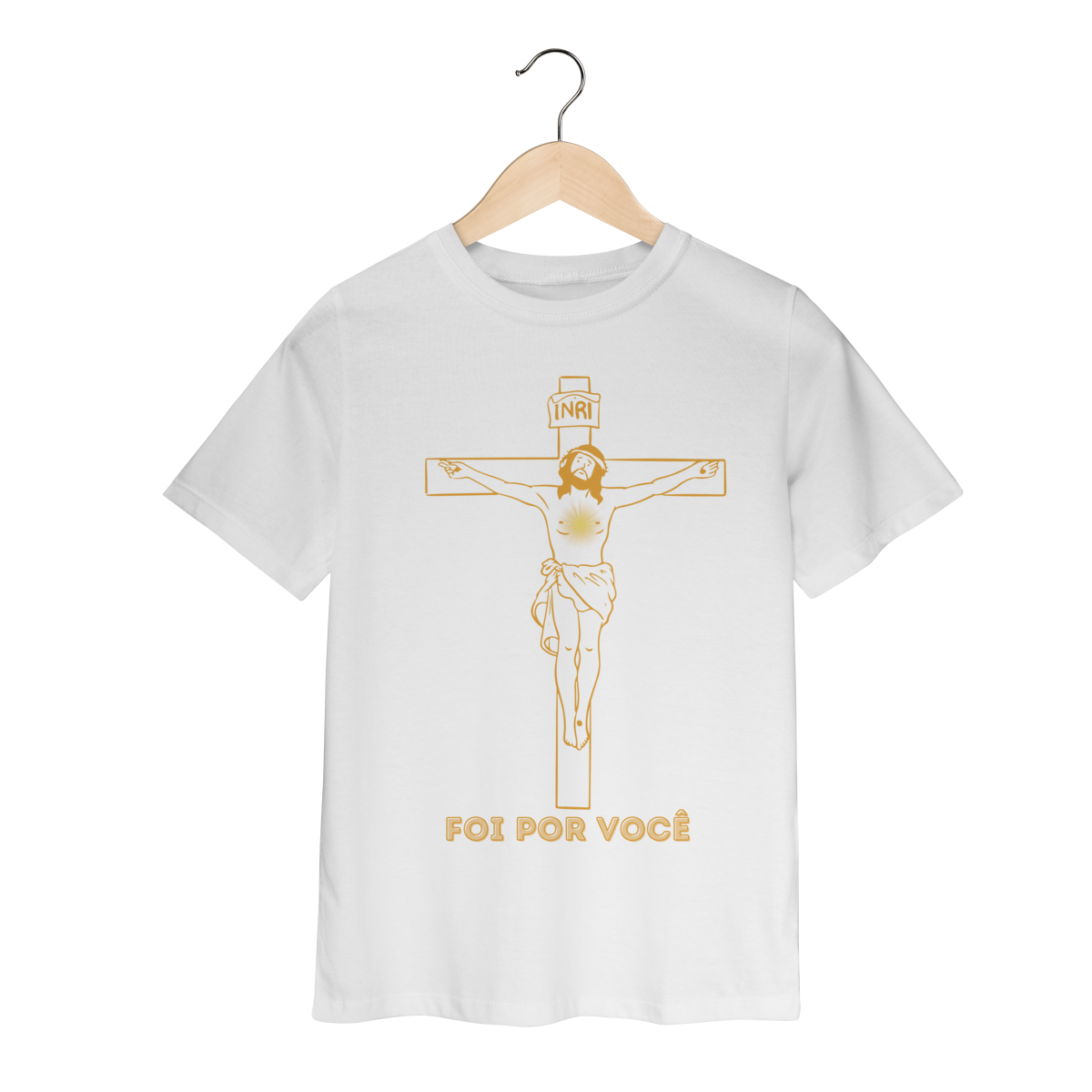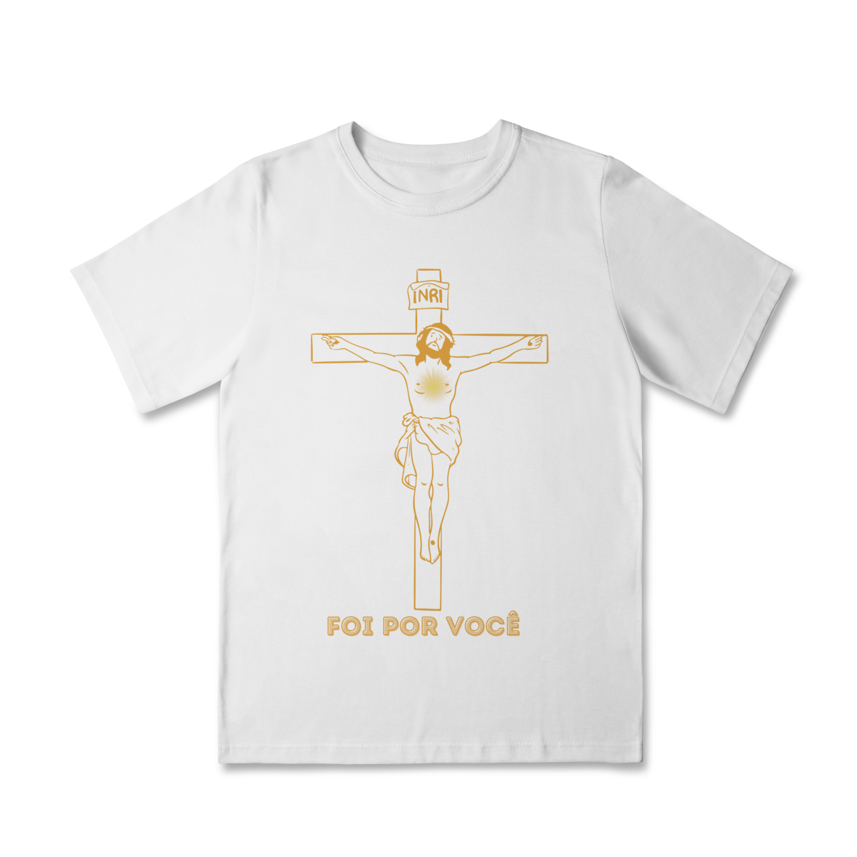 Vista a sua fé e compartilhe a mensagem do amor de Cristo com a Camiseta Foi por Você  - Cruz minimalista dourada.