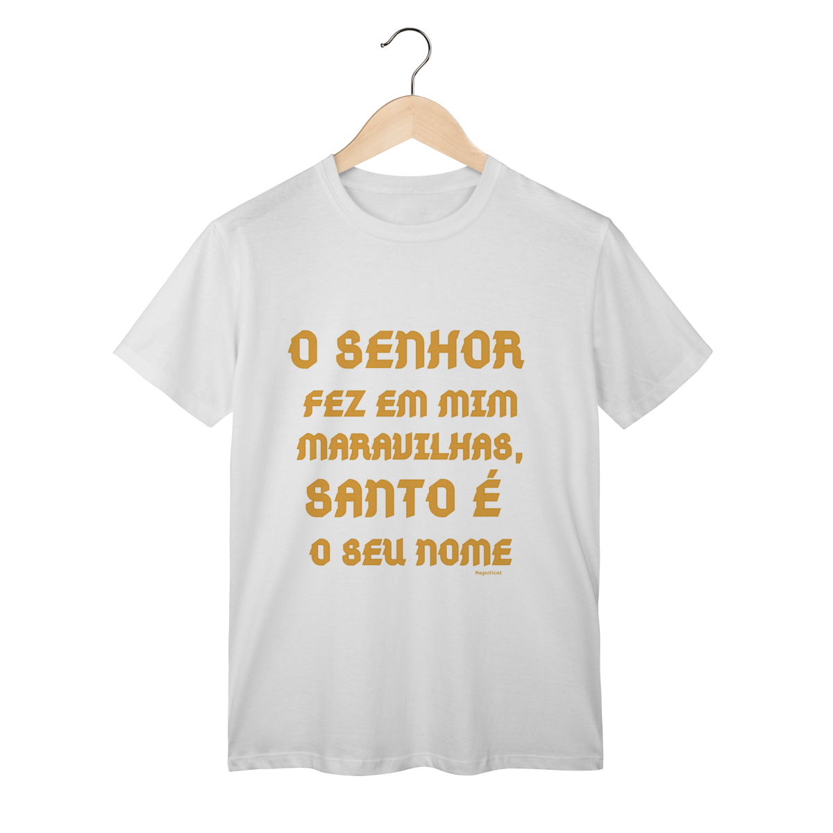 Celebre a gratidão e o louvor a Deus com a Camiseta Unissex T-Shirt Classic - O Senhor fez em mim maravilhas, Santo é Seu Nome. Com desenho minimalista em dourado e inspiração no cântico de Maria (Magnificat), essa peça transmite fé, humildade e alegria pela ação divina.