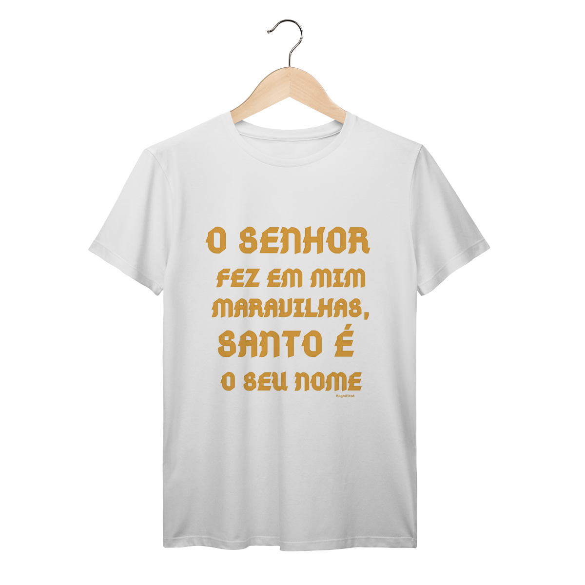 Celebre a gratidão e o louvor a Deus com a Camiseta Unissex T-Shirt Prime - O Senhor fez em mim maravilhas, Santo é Seu Nome. Com desenho minimalista em dourado e inspiração no cântico de Maria (Magnificat), essa peça transmite fé, humildade e alegria pela ação divina.