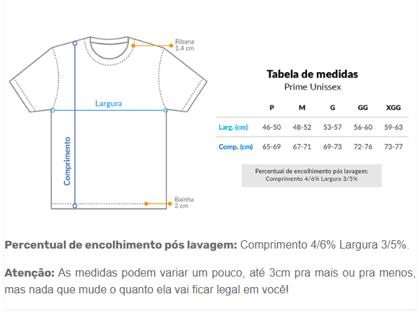 Cores do produto: Como cada tela de computador ou celular tem seu próprio jeito de mostrar cores, então a cor da sua camiseta e da estampa pode ser um pouco diferente do que você viu online.