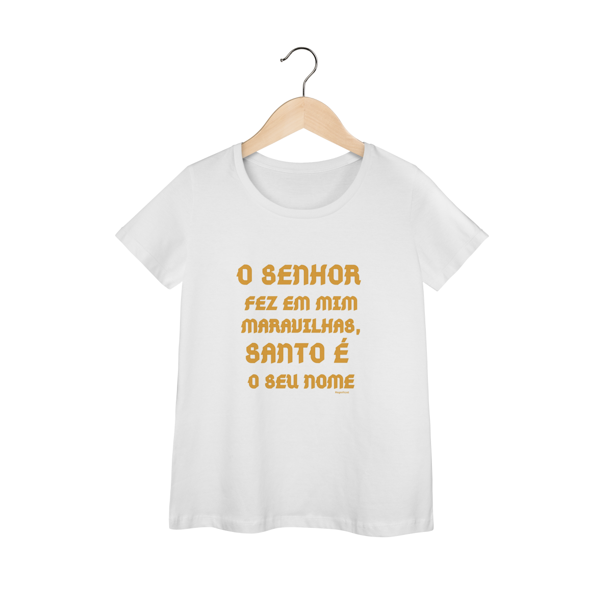 Celebre a gratidão e o louvor a Deus com a Camiseta Feminina Baby Long Prime - O Senhor fez em mim maravilhas, Santo é Seu Nome. Com desenho minimalista em dourado e inspiração no cântico de Maria (Magnificat), essa peça transmite fé, humildade e alegria pela ação divina.