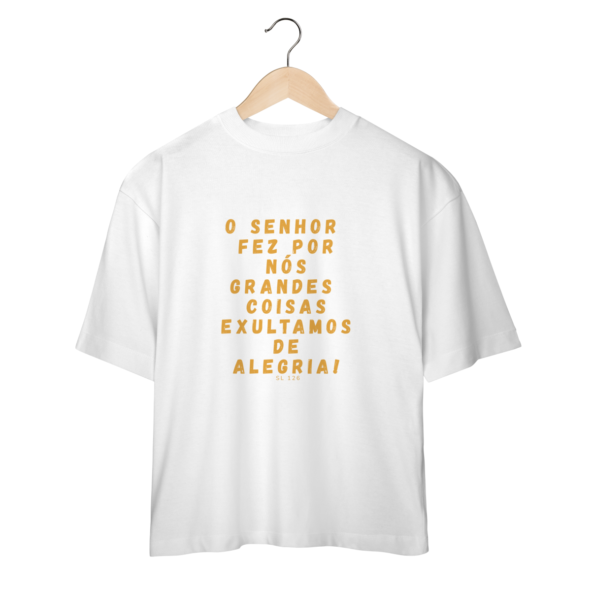 Leve a promessa de alegria e bênção para o seu dia com a Camiseta Oversized - Salmo 126. Com desenho minimalista em dourado e referência ao salmo que fala sobre restauração e felicidade, essa peça é ideal para quem deseja vestir mensagens bíblicas.