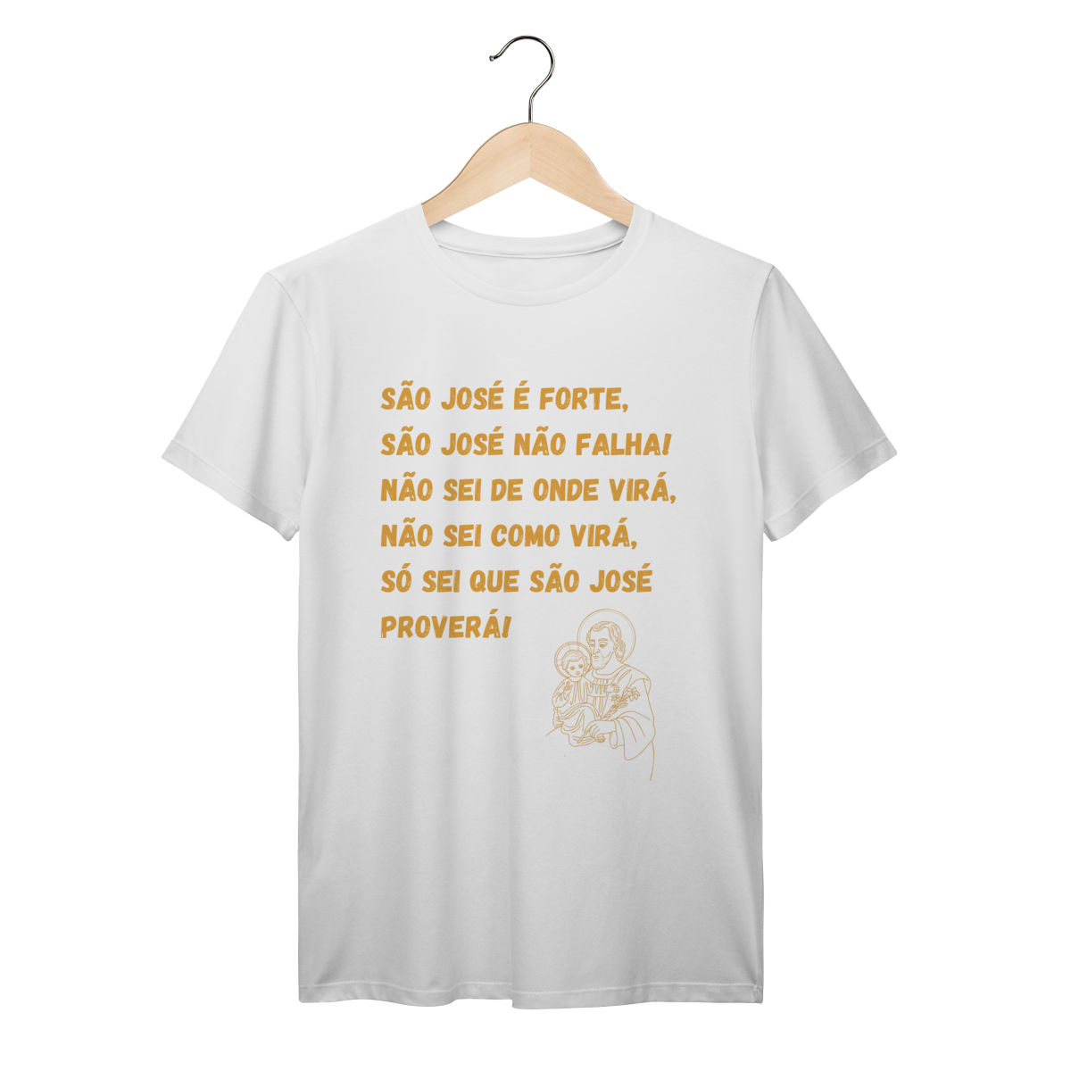 Mostre sua devoção com a Camiseta Unissex T-Shirt Prime - São José é Forte (Jaculatória). Com desenho minimalista em dourado e a jaculatória dedicada ao padroeiro da Igreja, essa peça é um ato de fé e inspiração.