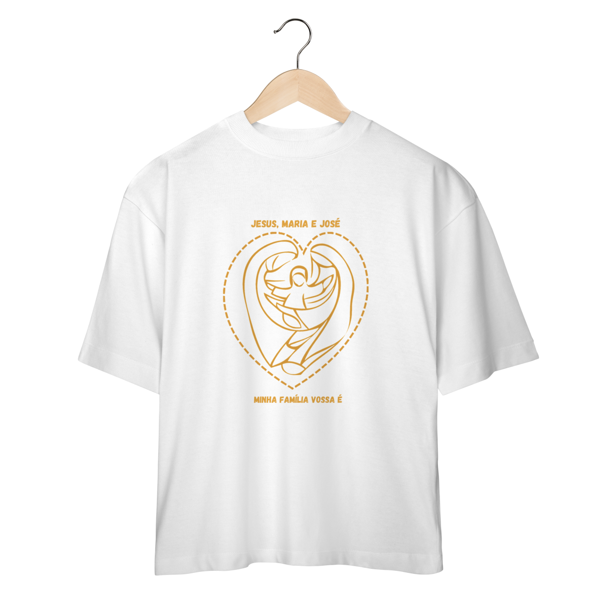 Celebre o amor, a união e a devoção com a Camiseta Oversized - Jesus, Maria e José  - Minha Família. Com um desenho minimalista em dourado exclusivo, essa peça representa a Sagrada Família como inspiração para todos os lares cristãos.