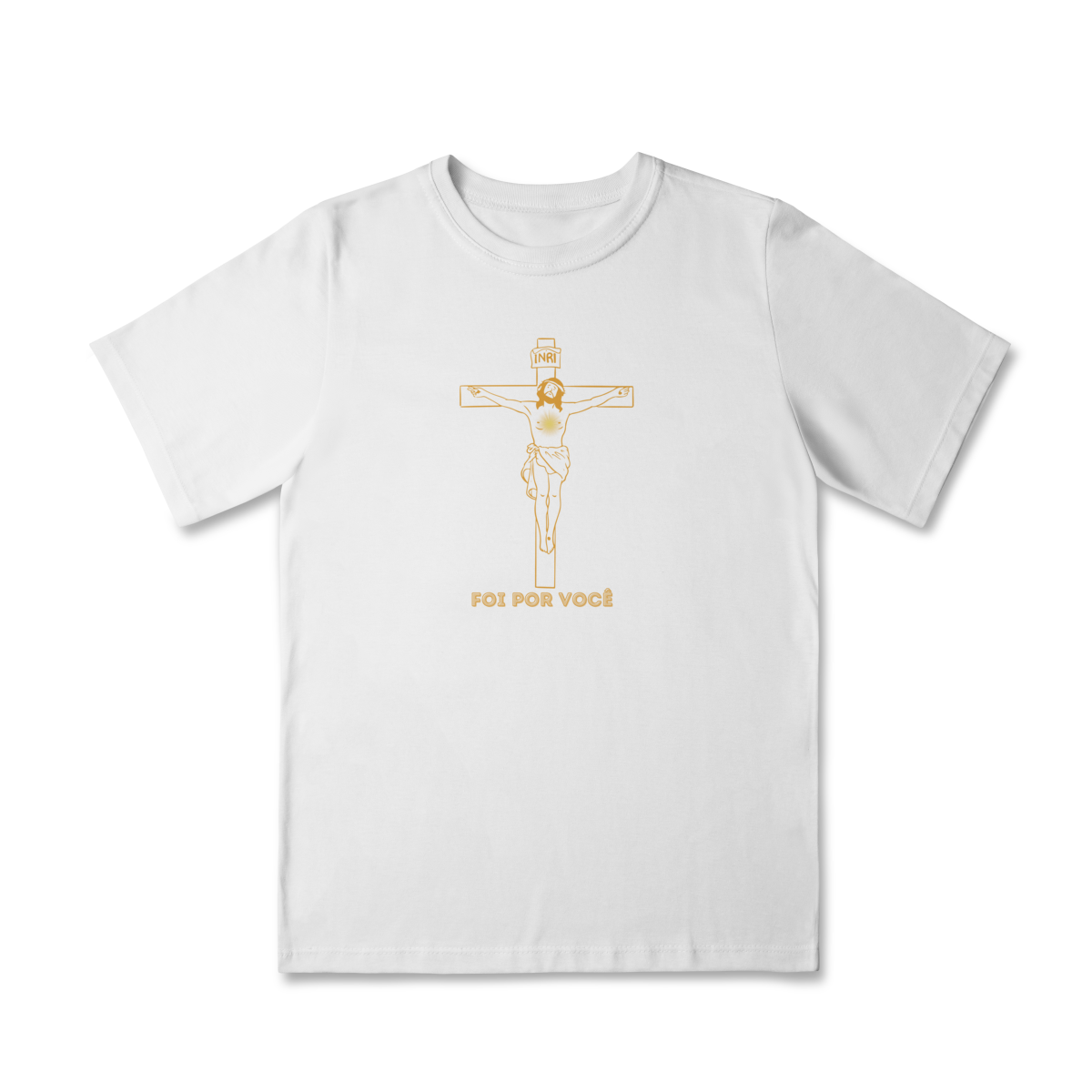 Vista a sua fé e compartilhe a mensagem do amor de Cristo com a Camiseta Foi por Você  - Cruz minimalista dourada.