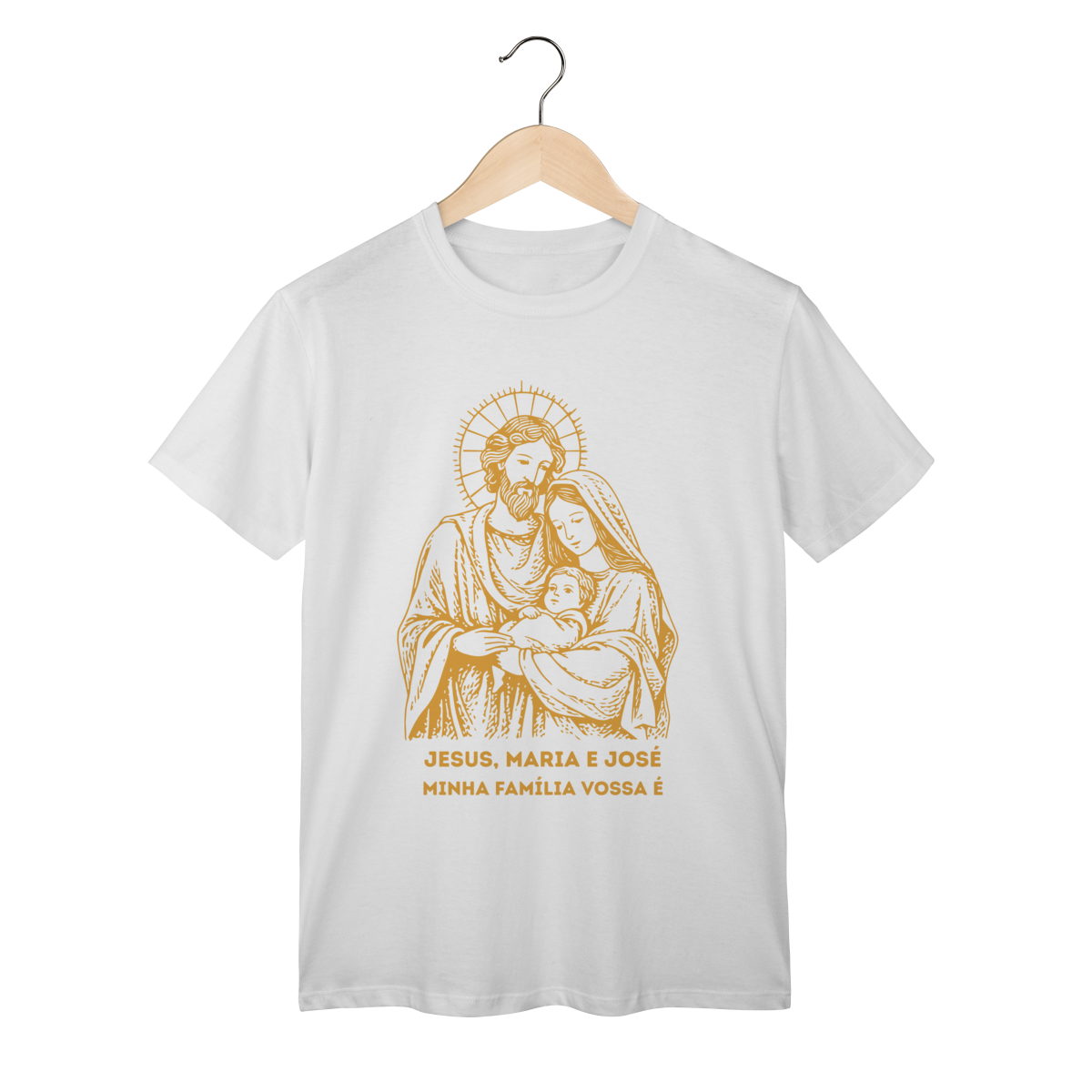 Vista a fé e o amor da Sagrada Família com a Camiseta Sagrada Família minimalista dourada e compartilhe mensagens de esperança por onde passar.