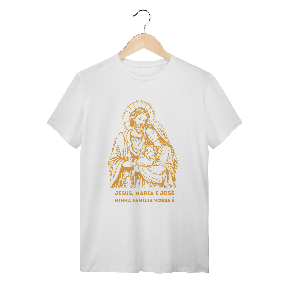 Vista a fé e o amor da Sagrada Família com a Camiseta Sagrada Família minimalista dourada e compartilhe mensagens de esperança por onde passar.