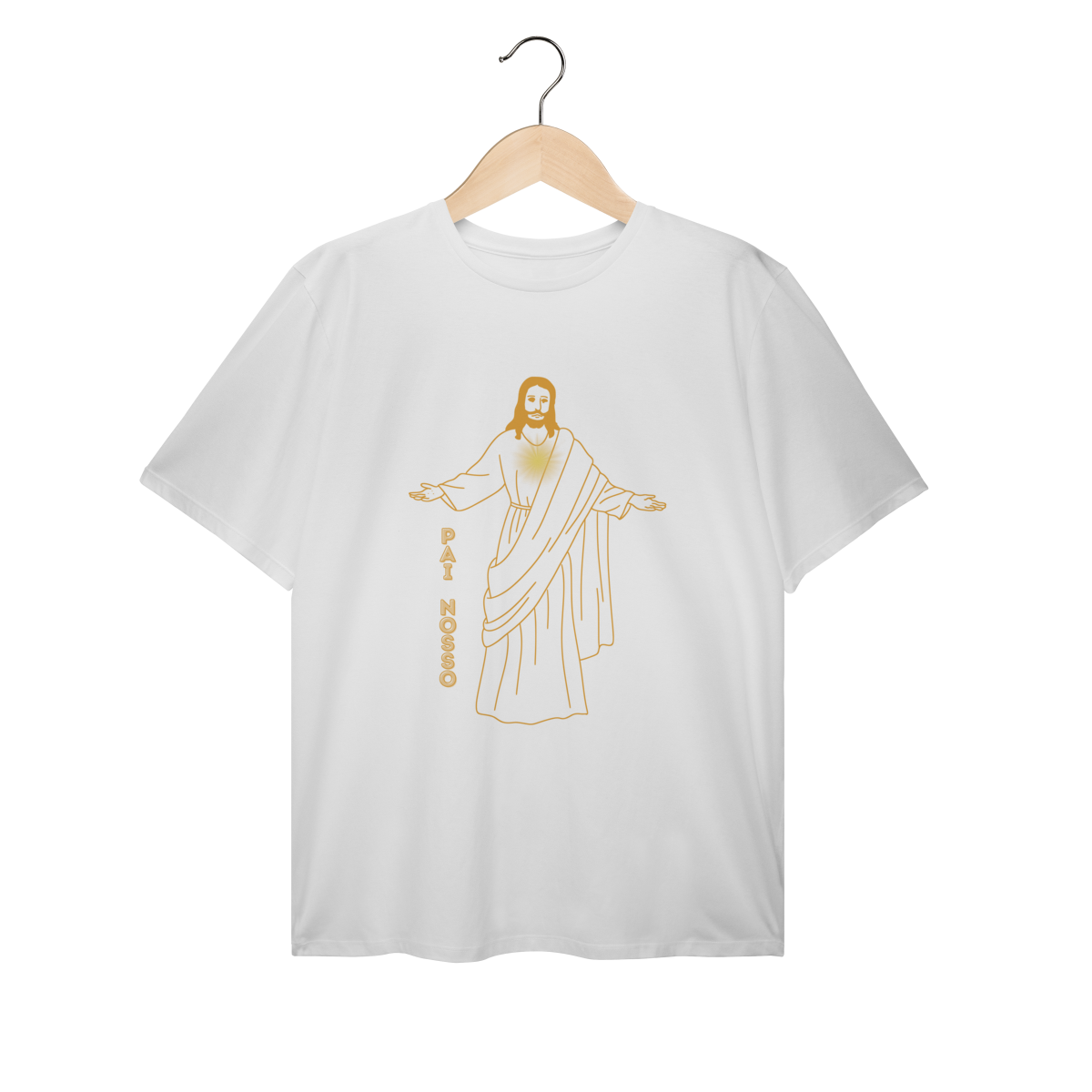 Expresse sua fé com elegância usando a Camiseta Unissex T-Shirt Plus Size - Jesus - Pai Nosso. Com um desenho minimalista em dourado exclusivo, essa peça foi criada para quem deseja levar a imagem mais conhecida do cristianismo no coração e no estilo.