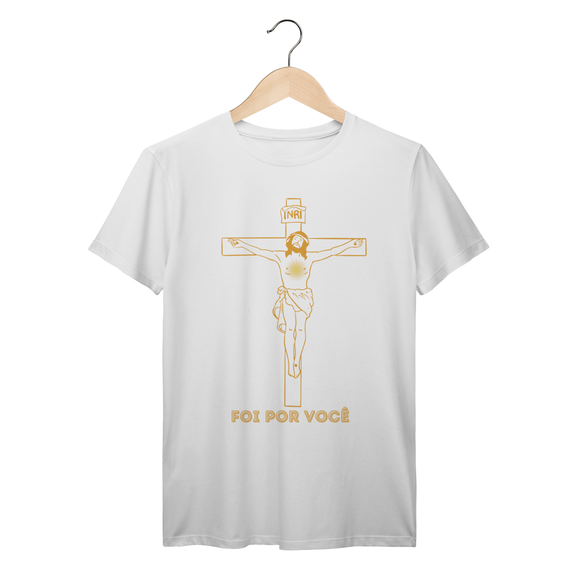 Vista a sua fé e compartilhe a mensagem do amor de Cristo com a Camiseta Foi por Você  - Cruz minimalista dourada.